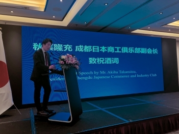 続いて、秋葉隆充・成都日本商工クラブ副会長が、広島・四川経済交流促進事務連絡室より提供された株式会社三宅本店(創業170年)の日本酒「千福」で乾杯の挨拶を行いました。
