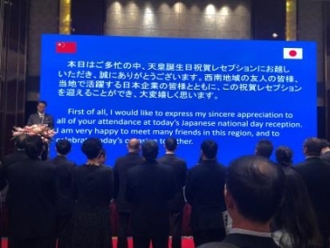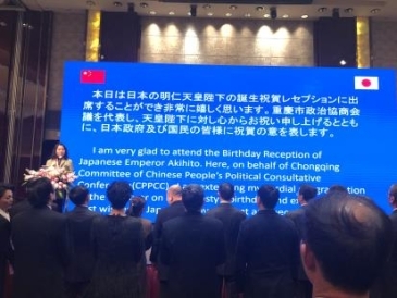 12月7日,在重庆JW万豪酒店举办了天皇诞辰招待酒会。以中国人民政治协商会议重庆市委员会副主席张玲女士为首、管辖地区(重庆市、四川省、云南省、贵州省)内政商界相关人士、日本侨民、各国领馆代表等约300人出席了活动。